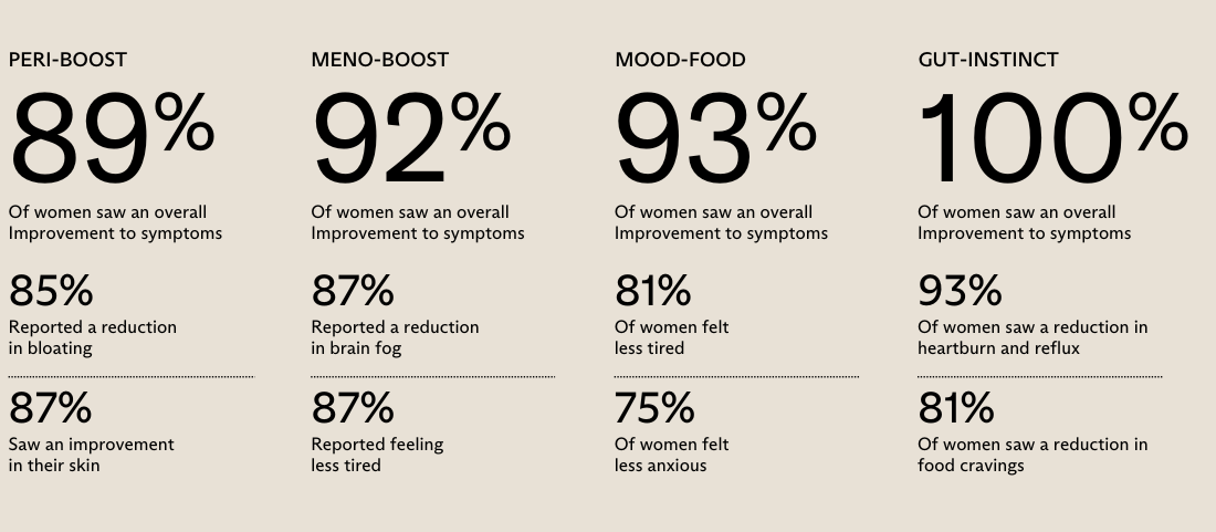 Our impact study participants are recruited via social media and screened purely for any underlying health conditions that may make our blends inappropriate or difficult to evaluate. We use the Greene Climacteric Scale3 and the Menopause Specific Quality of Life (MENQOL) protocol to assess symptom severity prior to the tracking study, the same framework used in doctor surgeries to identify menopause. Participants then track the most bothersome symptoms each week by SMS and long-form surveys. Insights gathered help us validate the results seen by individual ingredients in clinical trial settings. This data is then supported by 1000’s of customers who track the efficacy of our formulations every day in the real world and share their results directly with us too. Which means you know our blends have the seal of approval from people just like you.